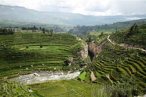 - Ponto de Vista Panorâmica de Tapay: Observação do fondo do desfiladeiro e os seus terraços escalonados incas, com uma maior perspectiva